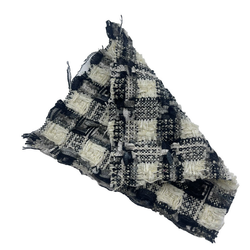 Ce tissu, désigné article 22042, est un textile en tweed tissé composé de 48 % d'acrylique, 36 % de polyester et 16 % de nylon. Avec une masse par unité de surface de 450 g/m², il présente une construction de poids moyen à lourd. La surface présente un fin motif à carreaux noirs et gris obtenu grâce à des techniques de tissage précises, créant une structure de grille uniforme. L'acrylique contribue au gonflant du tissu, le polyester assure la stabilité dimensionnelle et le nylon améliore la durabilité. Cette combinaison de fibres donne un matériau doté d’une intégrité structurelle et d’une résistance à l’abrasion. Ces spécifications techniques rendent ce tweed tissé applicable à la fabrication de manteaux où des motifs définis et des performances à long terme sont requis.